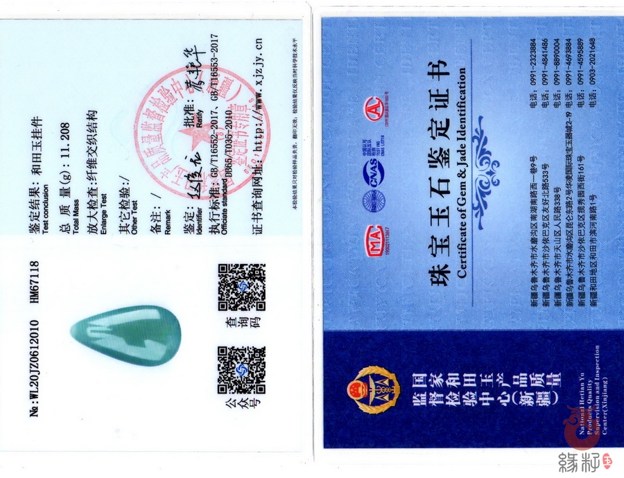 (附:新疆岩矿宝玉石产品质量监督检验站;国家和田玉产品质量监督检验中心样例)