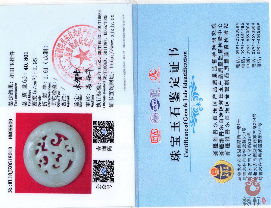 (附:新疆岩矿宝玉石产品质量监督检验站;国家和田玉产品质量监督检验中心样例)