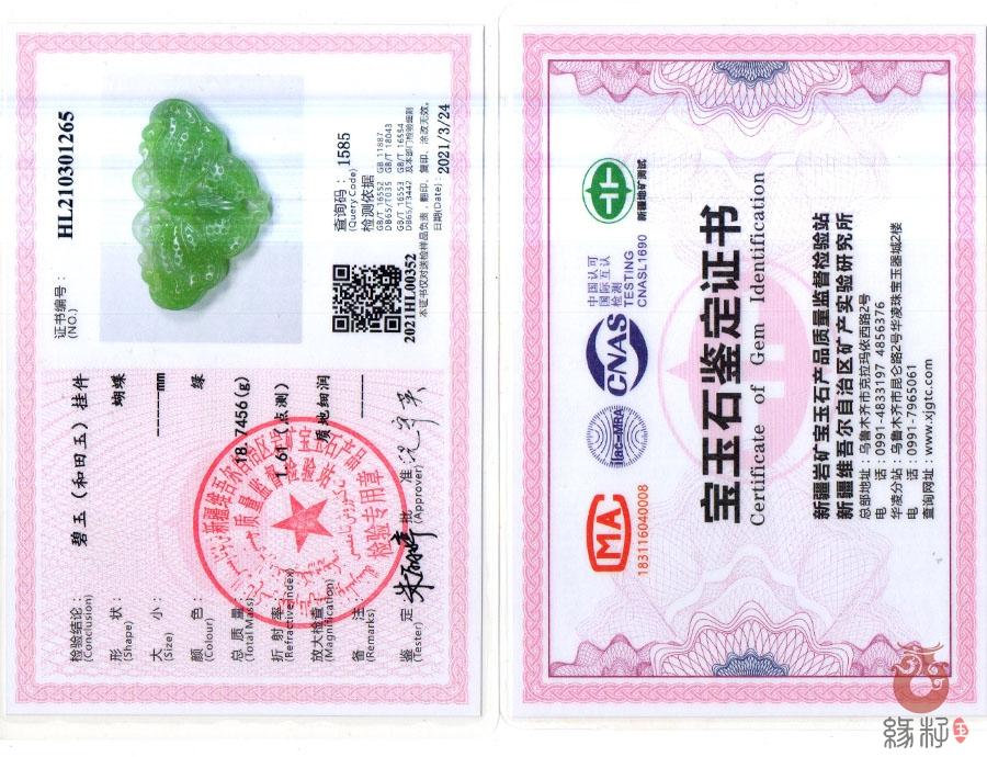 中国新疆和田玉网出售的商品均出具以下资质的国家权威质检部门质检证书: