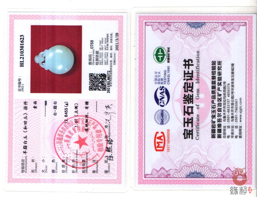 中国新疆和田玉网出售的商品均出具以下资质的国家权威质检部门质检证书:
