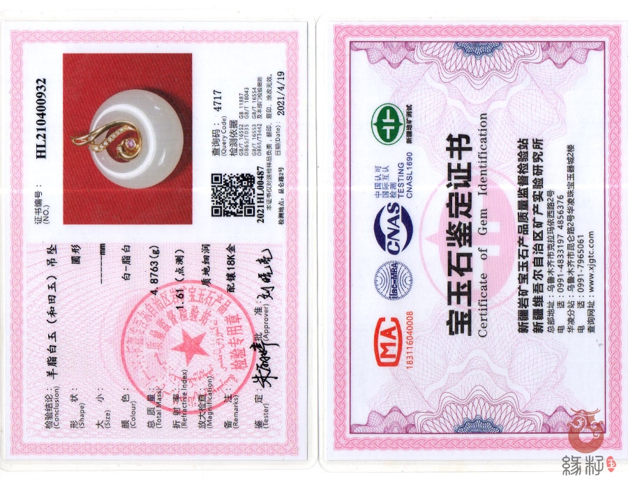 (附:新疆岩矿宝玉石产品质量监督检验站;国家和田玉产品质量监督检验中心样例)
