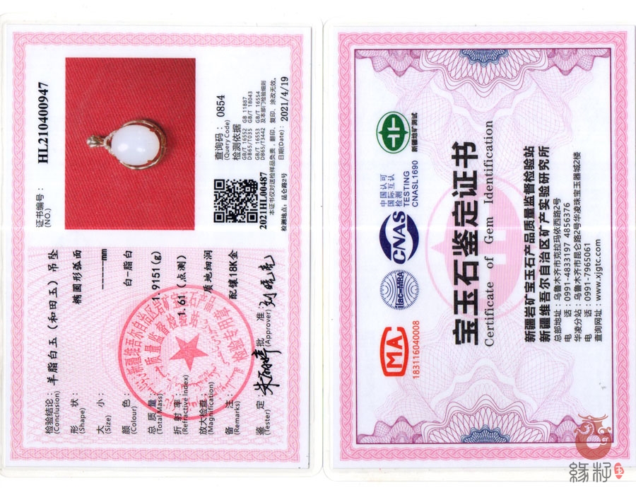 (附:新疆岩矿宝玉石产品质量监督检验站国家和田玉产品质量监督检验中心样例)
