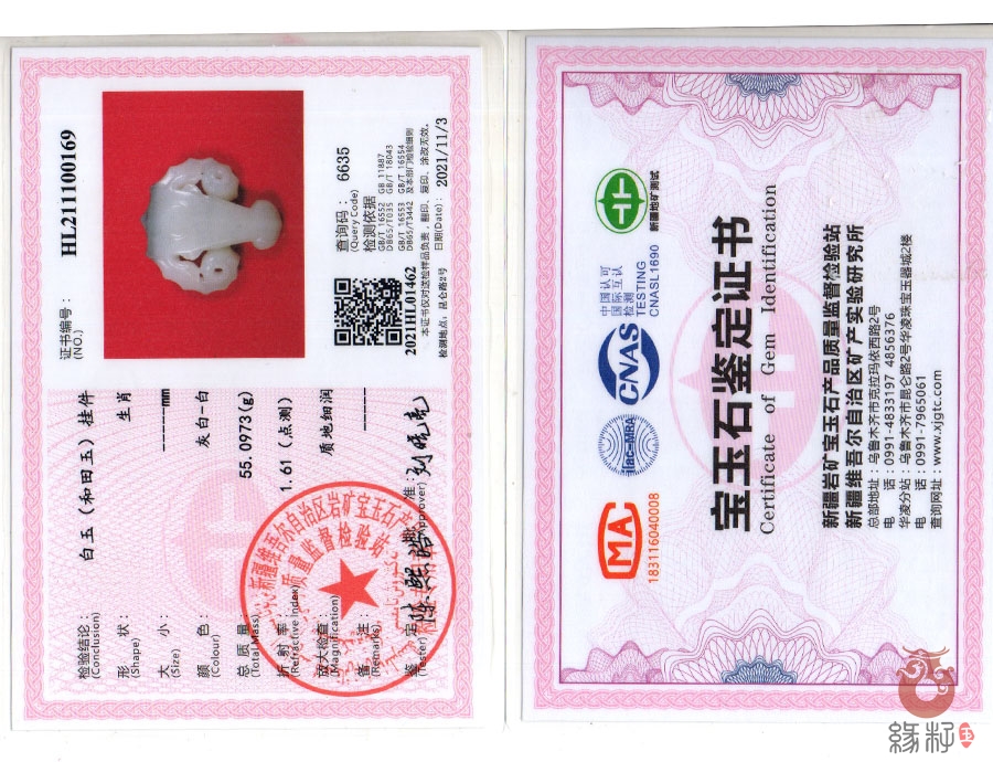 (附:新疆岩矿宝玉石产品质量监督检验站;国家和田玉产品质量监督检验中心样例)