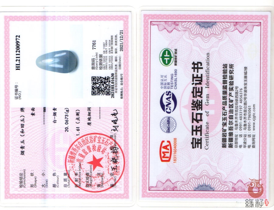 (附:新疆岩矿宝玉石产品质量监督检验站;国家和田玉产品质量监督检验中心样例)