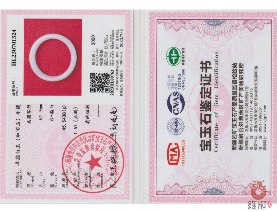 (附:新疆岩矿宝玉石产品质量监督检验站;国家和田玉产品质量监督检验中心样例)