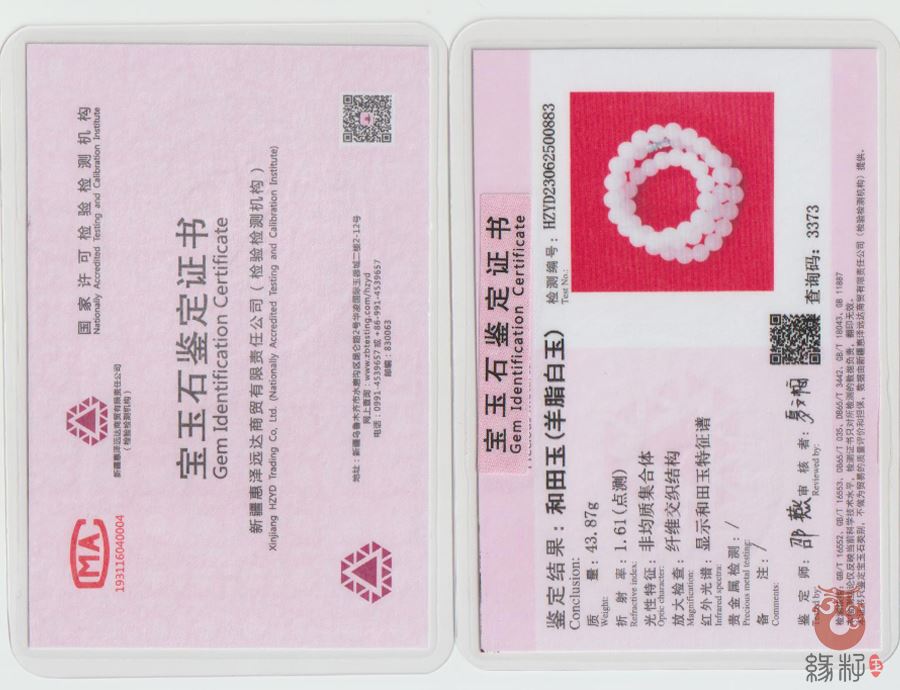 (附:新疆岩矿宝玉石产品质量监督检验站国家和田玉产品质量监督检验中心样例)