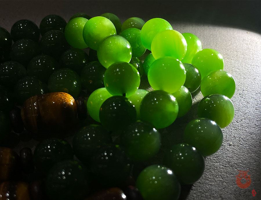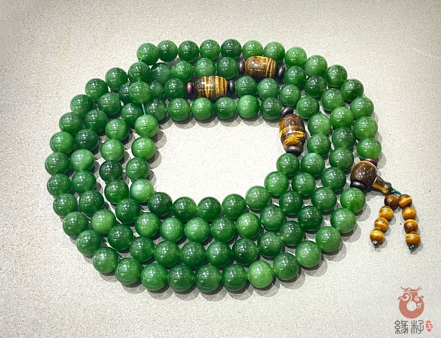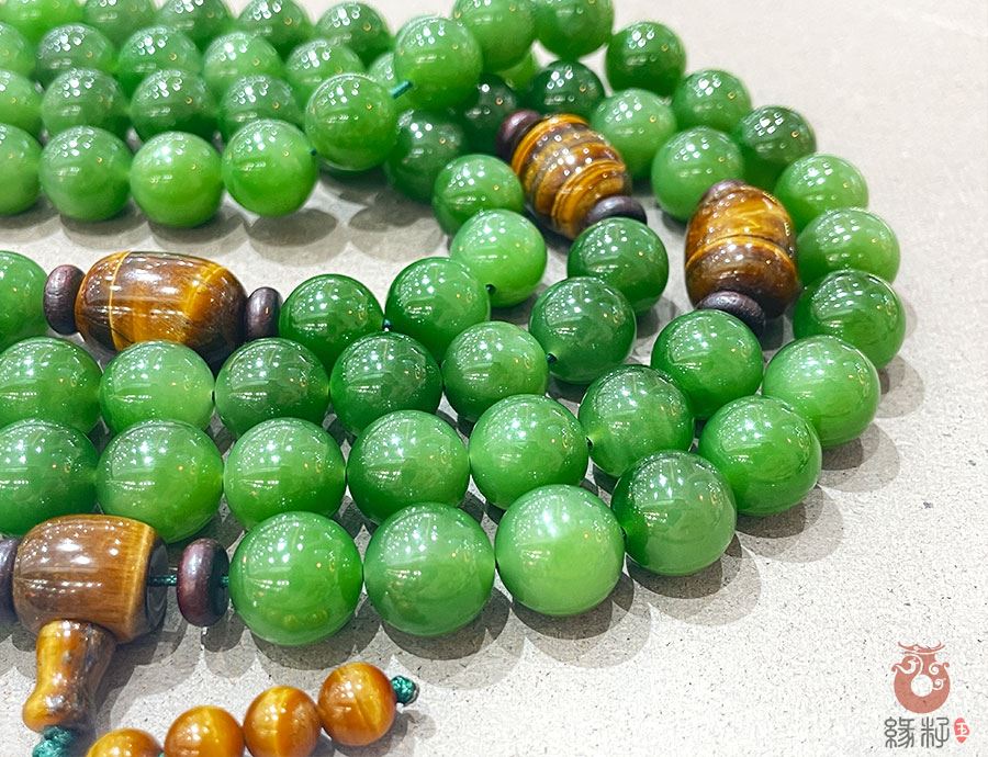 作品简述:和田玉佛珠项链选用纯天然上等和田玉碧玉猫眼原料,颗颗精选,晶莹圆润饱满,和田玉碧玉12mm珠佛珠项链质地纯净,油润光泽细腻,国检证书