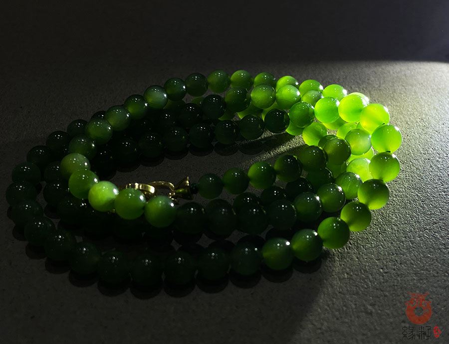 作品特色: 色泽果绿萃青,清爽洁净,高雅艳丽,天然和田玉苹果绿碧玉精品;个体圆润饱满,大小规整,色泽均匀,质地洁净细腻;