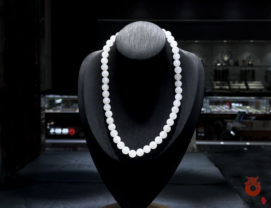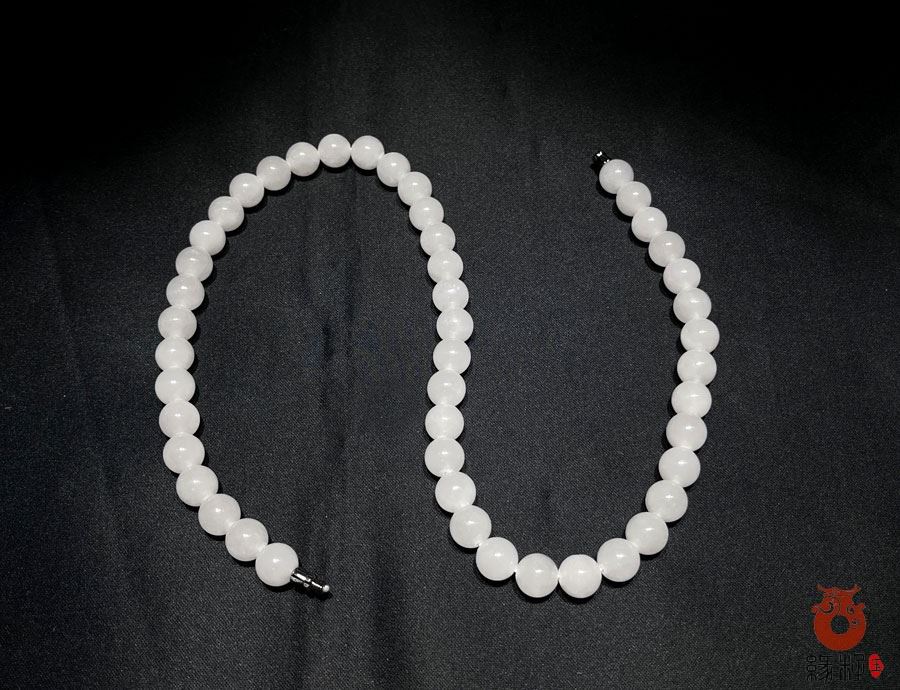 作品简述:和田玉项链选用纯天然上等和田玉白玉原料,颗颗精选,晶莹圆润饱满,和田玉白玉10mm珠项链质地纯净,油润光泽细腻,国检证书