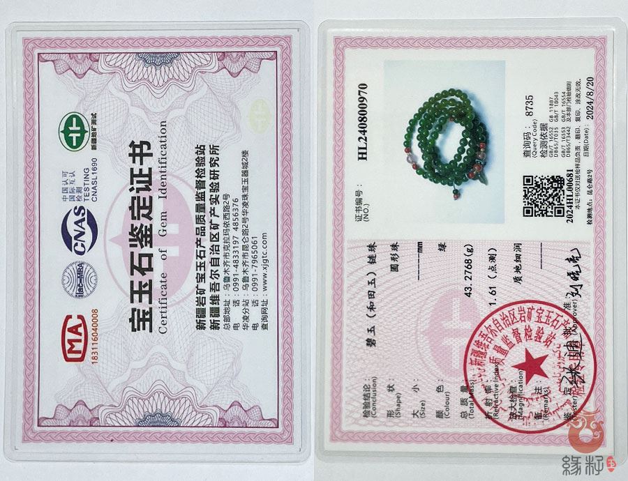(附:新疆岩矿宝玉石产品质量监督检验站国家和田玉产品质量监督检验中心样例)