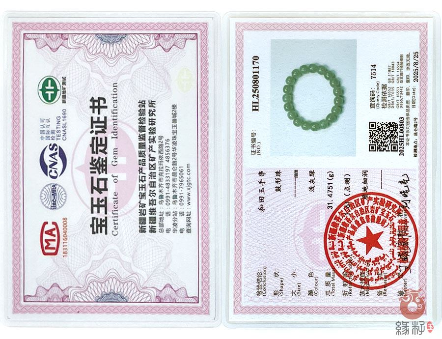 中国新疆和田玉网出售的商品均出具以下资质的国家权威质检部门质检证书: