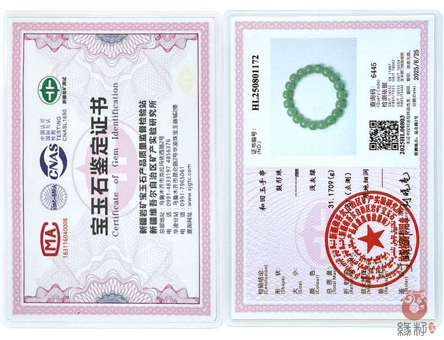 (附:新疆岩矿宝玉石产品质量监督检验站国家和田玉产品质量监督检验中心样例)