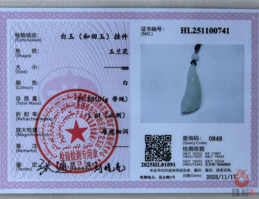 (附:新疆岩矿宝玉石产品质量监督检验站国家和田玉产品质量监督检验中心样例)