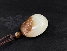 作品特色: 玉质温润细腻,油糯老熟,结构及色泽均匀且致密无杂质,属高端和田玉料/糖白交互自然沁润,天然优质糖白玉精品;传统经典设计,神态亲善祥和,动静神似,圆满,端庄喜庆/专业柔光技工精心细致多遍打磨,柔光层次分明,油糯,高贵典雅,意,形,材,工集作品于一体;手编挂绳/精美包装礼盒及手提袋。