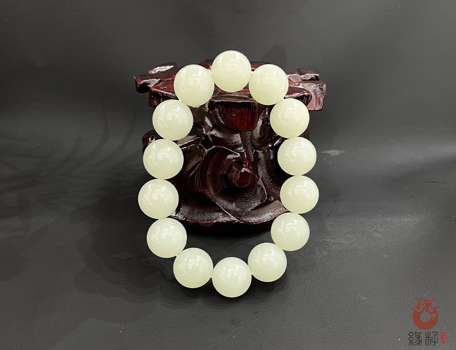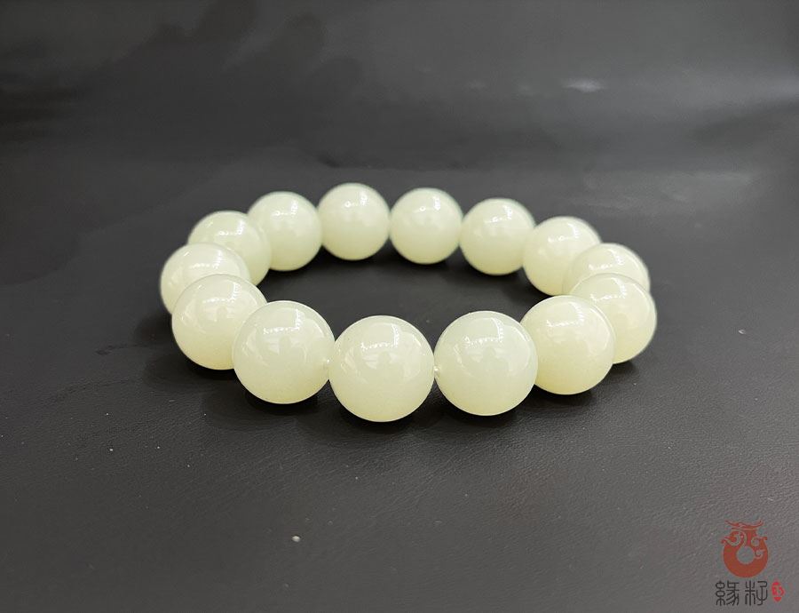 作品简述:和田玉手串选用纯天然上等和田玉原料,颗颗精选,晶莹圆润饱满,和田玉16mm圆珠手串质地纯净,油润光泽细腻