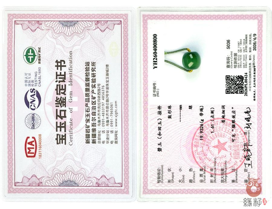 (附:新疆岩矿宝玉石产品质量监督检验站国家和田玉产品质量监督检验中心样例)