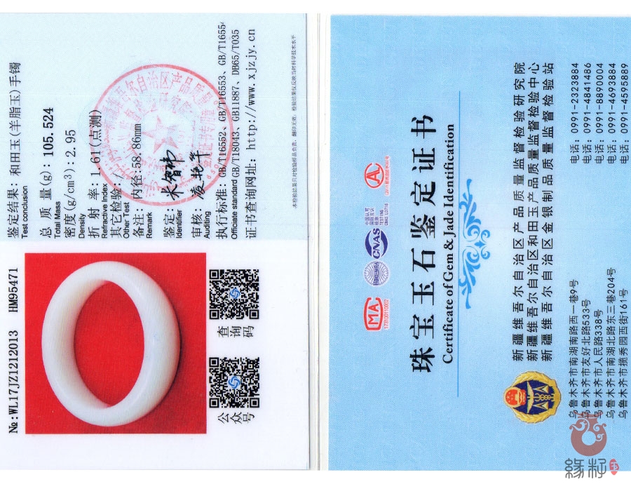 (附:新疆岩矿宝玉石产品质量监督检验站国家和田玉产品质量监督检验中心样例)