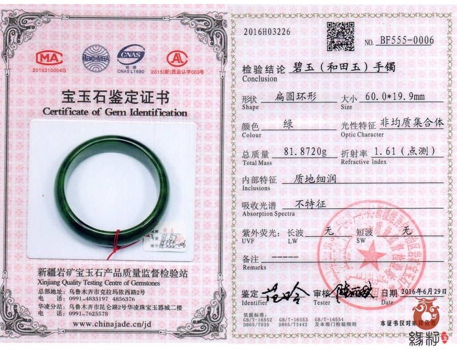 中国新疆和田玉网出售的商品均出具以下资质的国家权威质检部门质检证书: