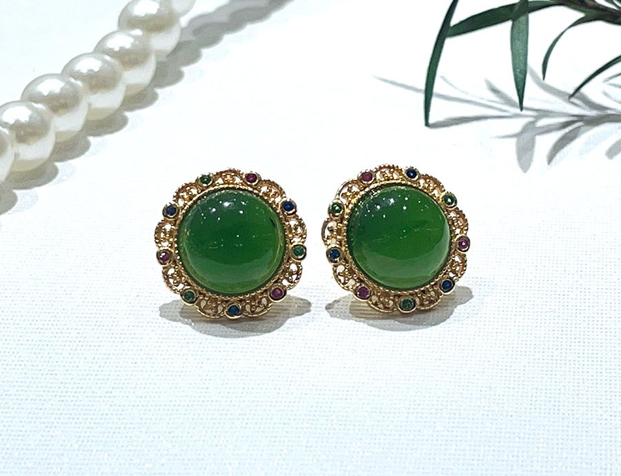 和田玉银镶耳钉和田玉碧玉圆形925银镶耳钉