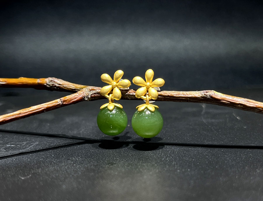 和田玉银镶耳钉和田玉碧玉圆球花瓣925银镶耳坠
