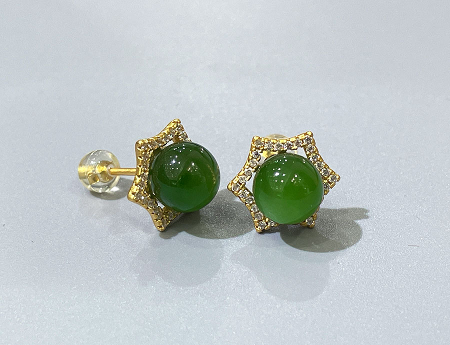 和田玉银镶耳钉和田玉碧玉圆球六角星925银镶耳坠