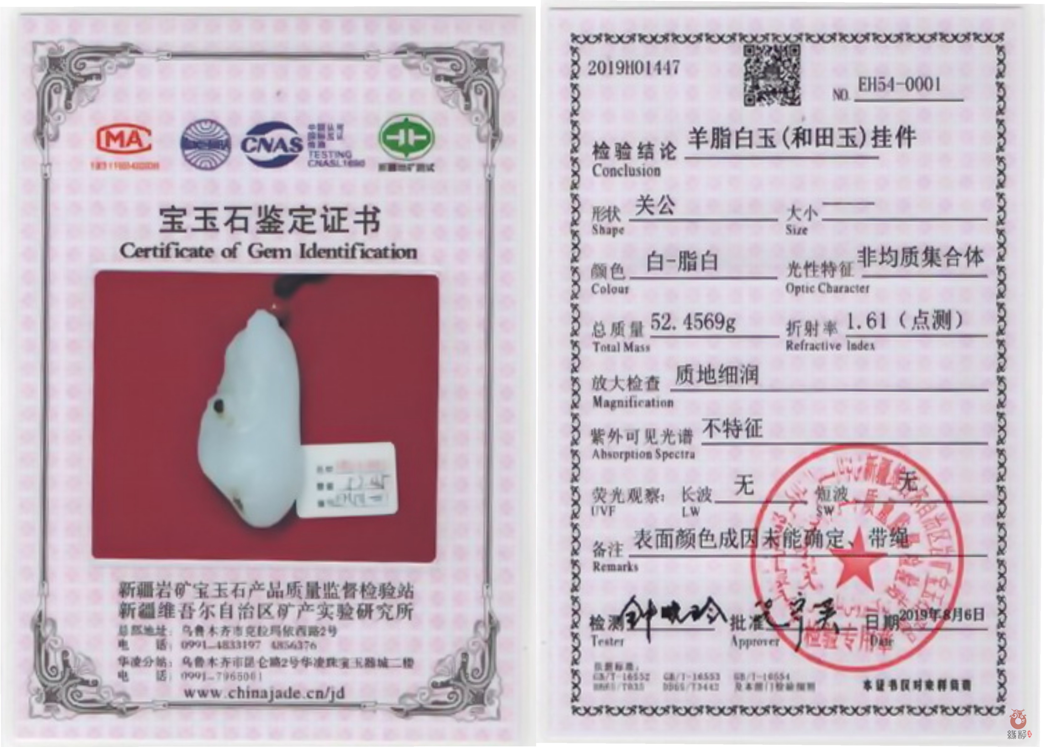 (附:新疆岩矿宝玉石产品质量监督检验站国家和田玉产品质量监督检验中心样例)