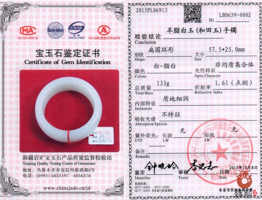 中国新疆和田玉网出售的商品均出具以下资质的国家权威质检部门质检证书: