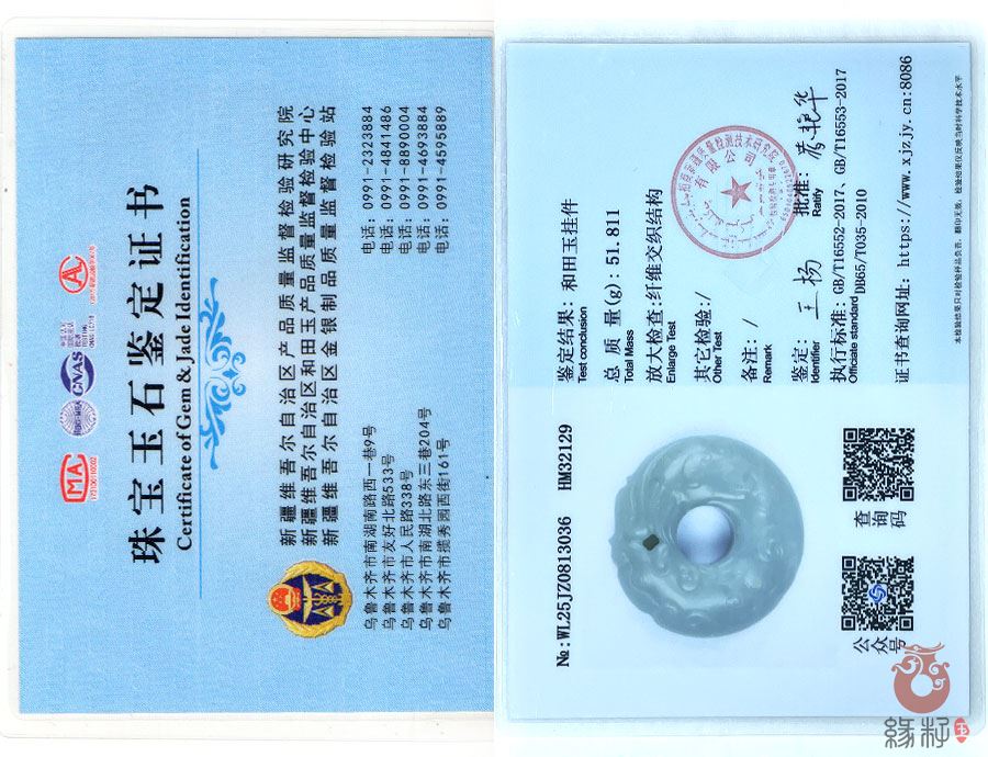 中国新疆和田玉网出售的商品均出具以下资质的国家权威质检部门质检证书: