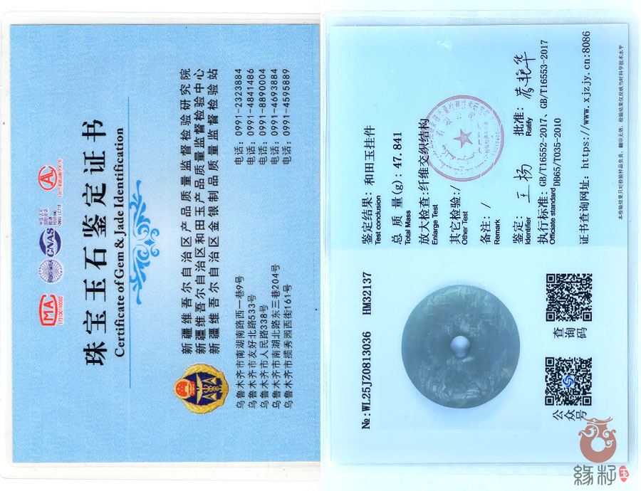 (附:新疆岩矿宝玉石产品质量监督检验站;国家和田玉产品质量监督检验中心样例)