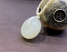 作品特色: 白糯飘青,色泽均匀纯正,清雅高贵,清白一身,纯天然和田玉青白玉精品;手编挂绳。