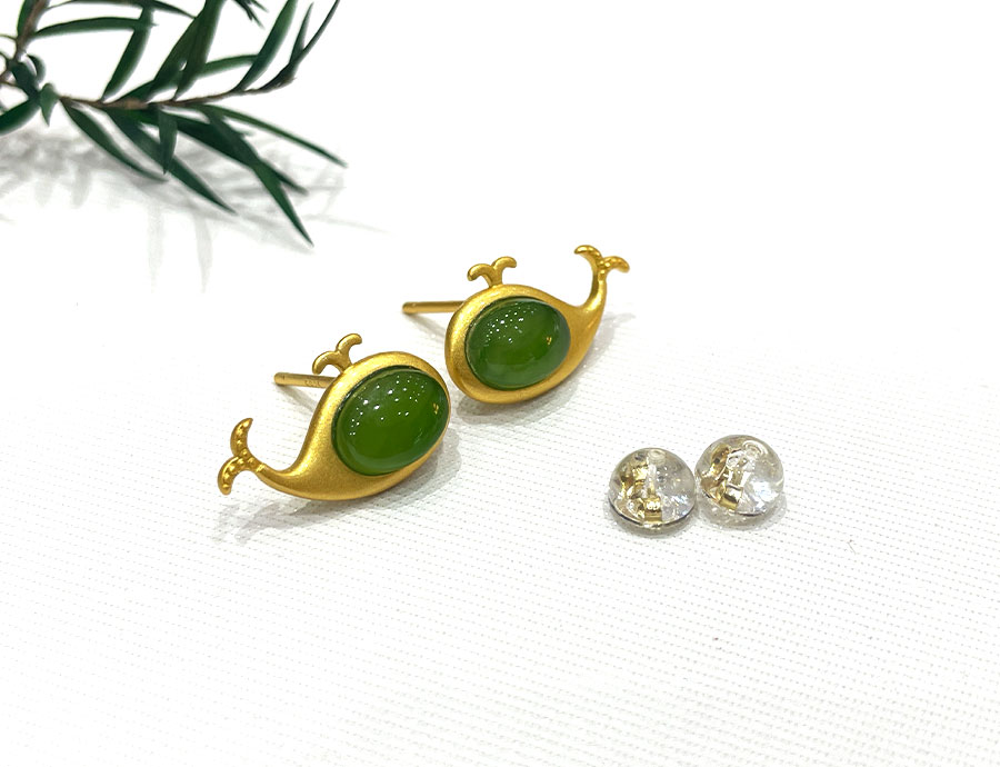 和田玉银镶耳钉和田玉碧玉鲸鱼925银镶耳坠
