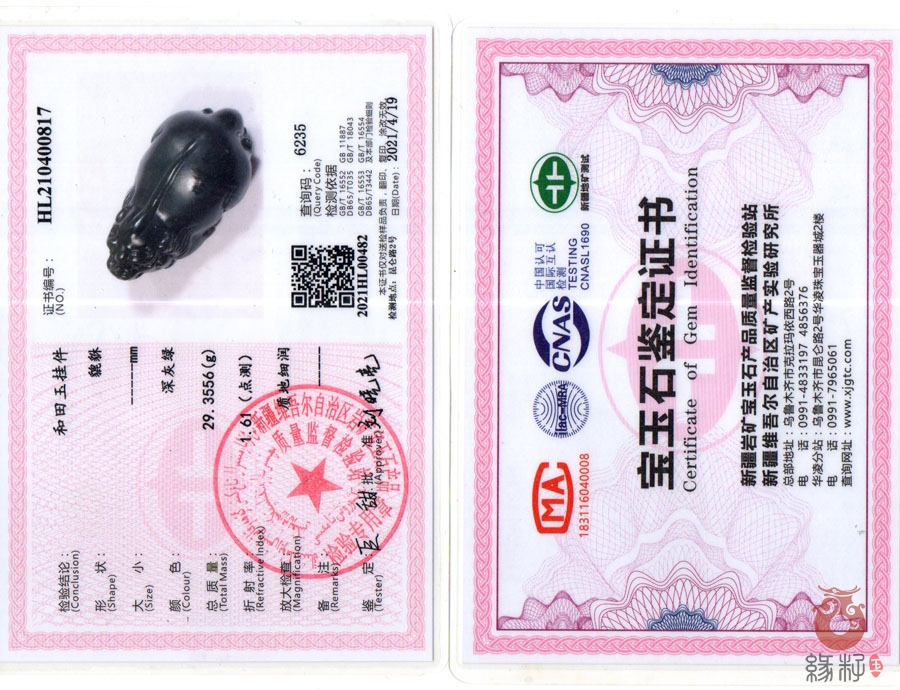 (附:新疆岩矿宝玉石产品质量监督检验站国家和田玉产品质量监督检验中心样例)