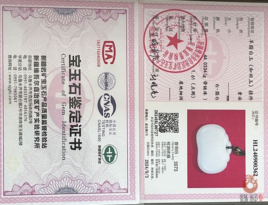 中国新疆和田玉网出售的商品均出具以下资质的国家权威质检部门质检证书: