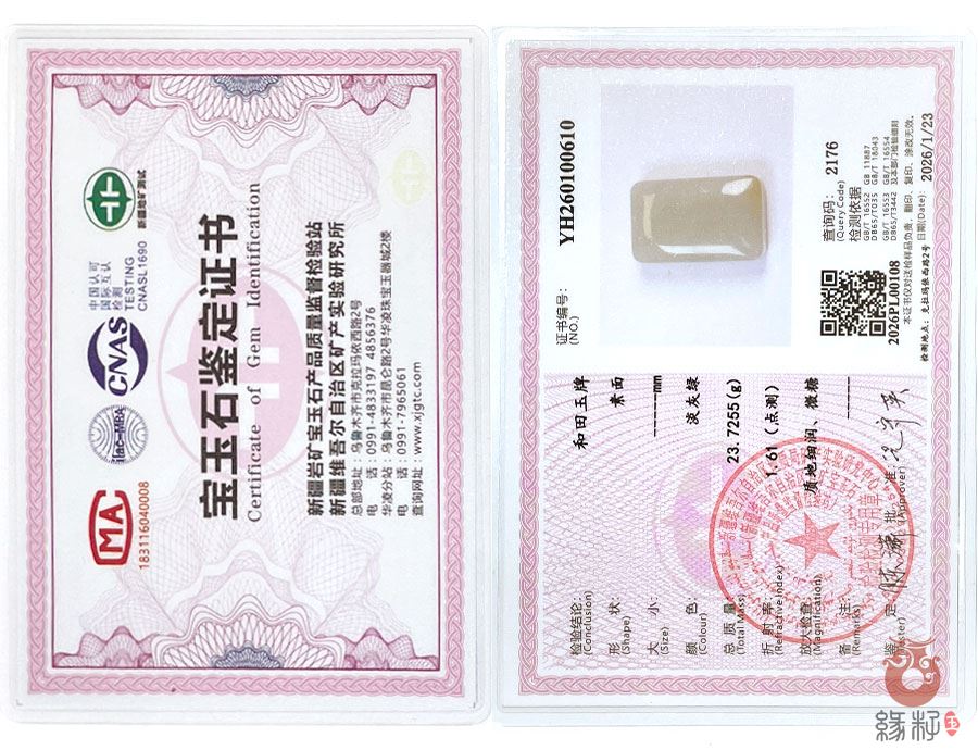 (附:新疆岩矿宝玉石产品质量监督检验站国家和田玉产品质量监督检验中心样例)