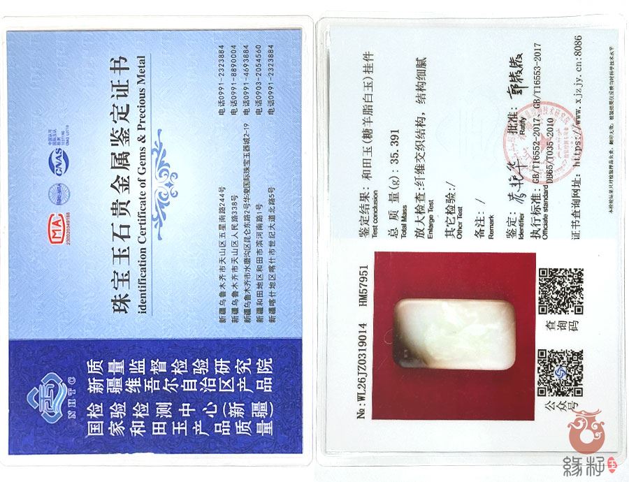 (附:新疆岩矿宝玉石产品质量监督检验站国家和田玉产品质量监督检验中心样例)
