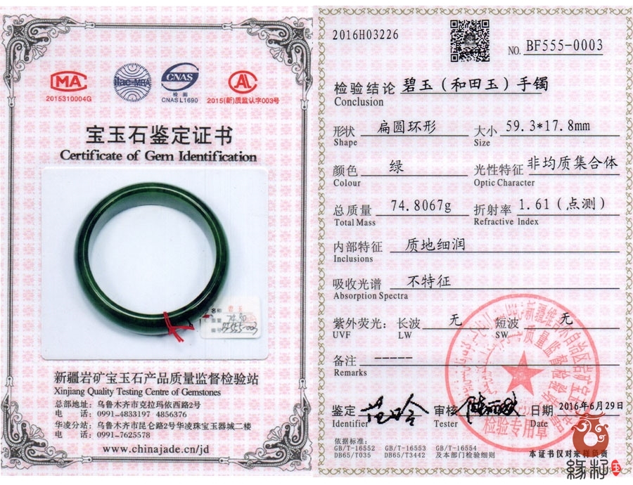 (附:新疆岩矿宝玉石产品质量监督检验站国家和田玉产品质量监督检验中心样例)