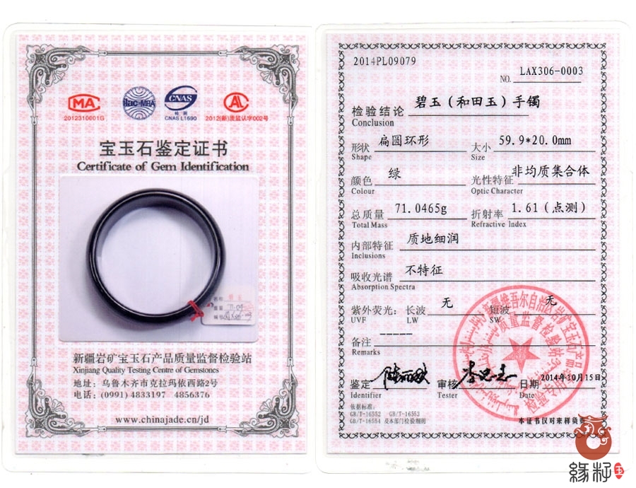 中国新疆和田玉网出售的商品均出具以下资质的国家权威质检部门质检证书: