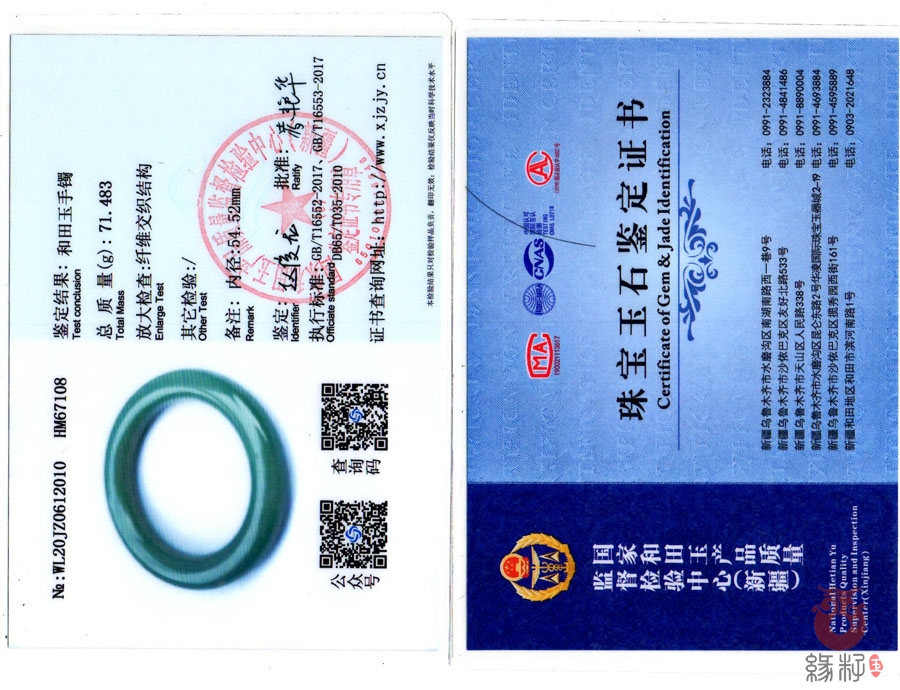 (附:新疆岩矿宝玉石产品质量监督检验站国家和田玉产品质量监督检验中心样例)