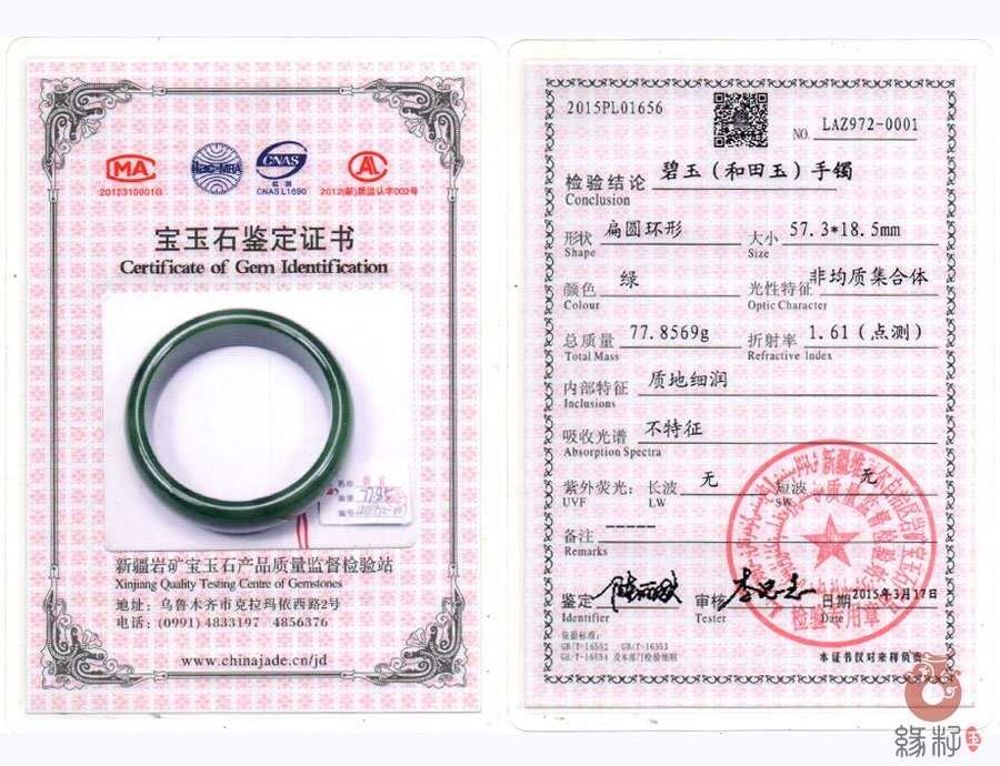 中国新疆和田玉网出售的商品均出具以下资质的国家权威质检部门质检证书: