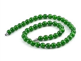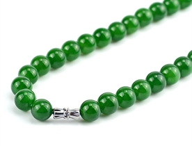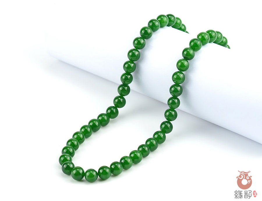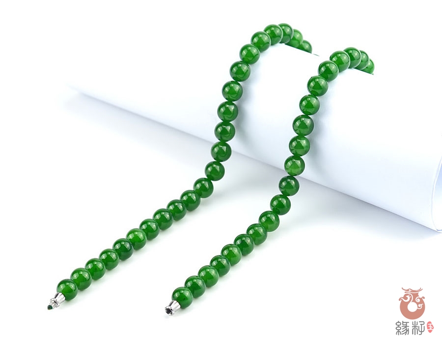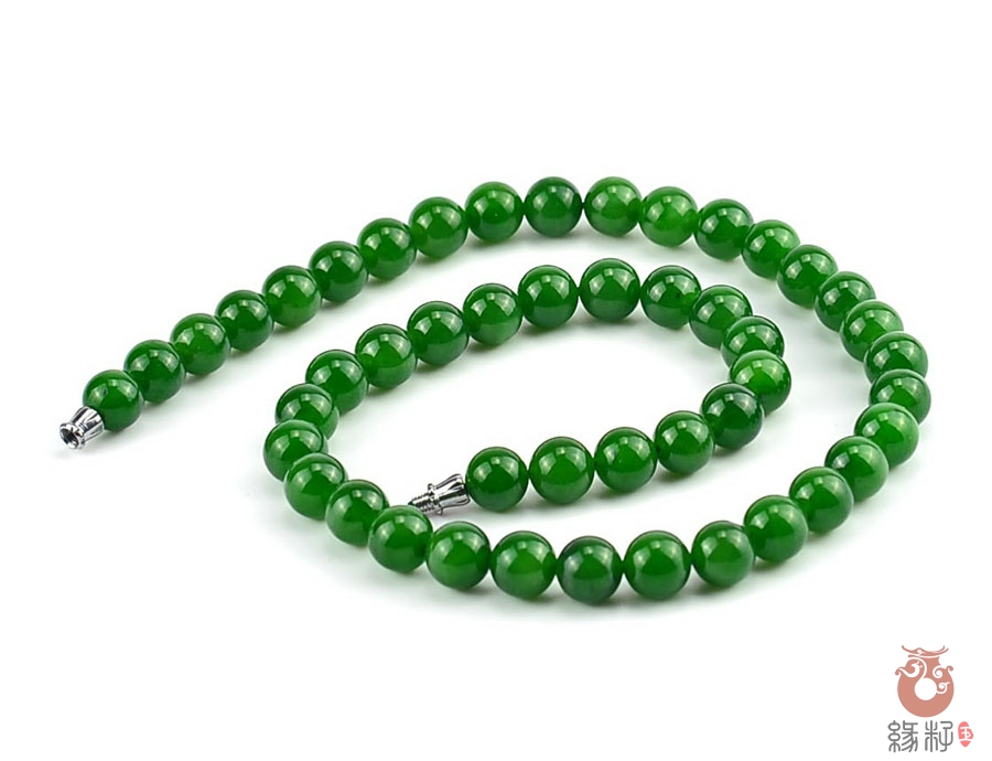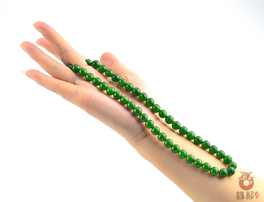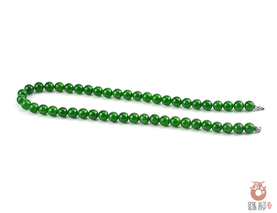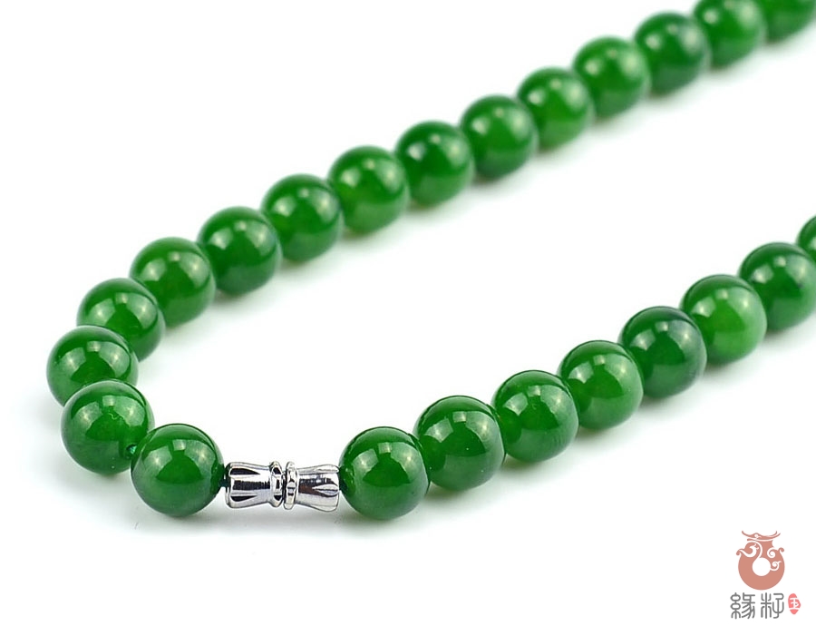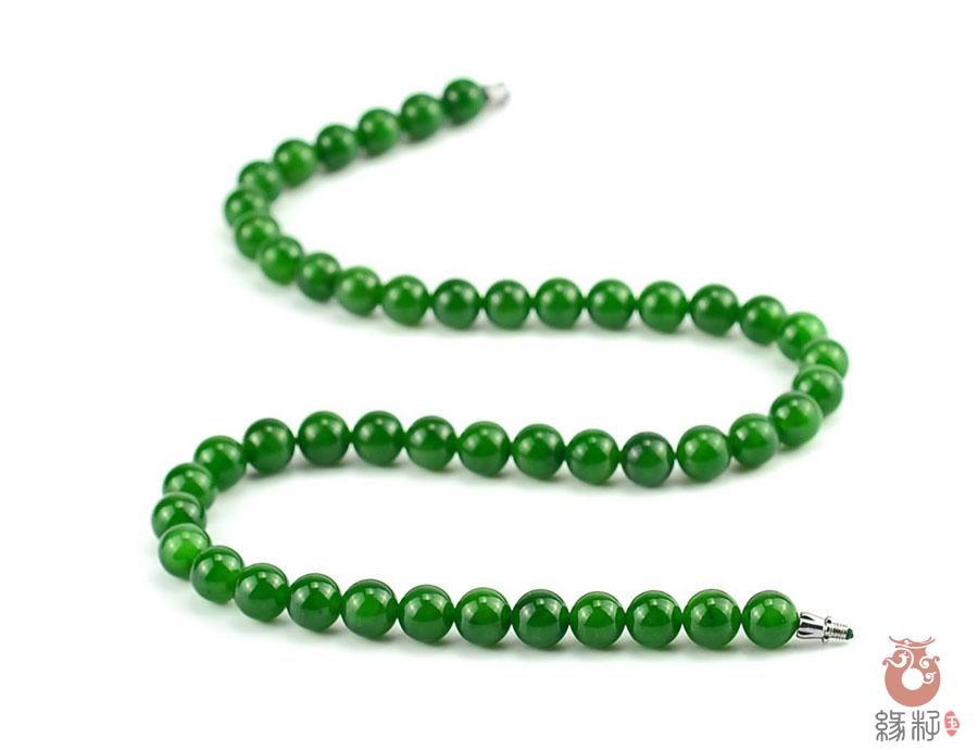 作品简述:和田玉项链选用纯天然上等和田玉碧玉原料,颗颗精选,晶莹圆润饱满,和田玉碧玉9mm珠项链质地纯净,油润光泽细腻,国检证书