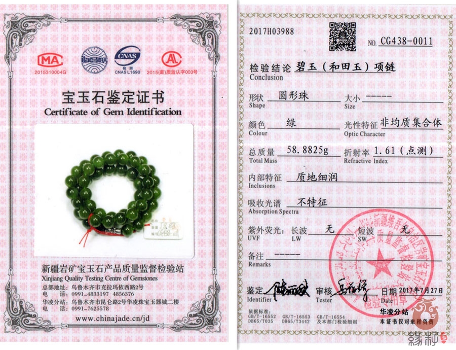 (附:新疆岩矿宝玉石产品质量监督检验站国家和田玉产品质量监督检验中心样例)