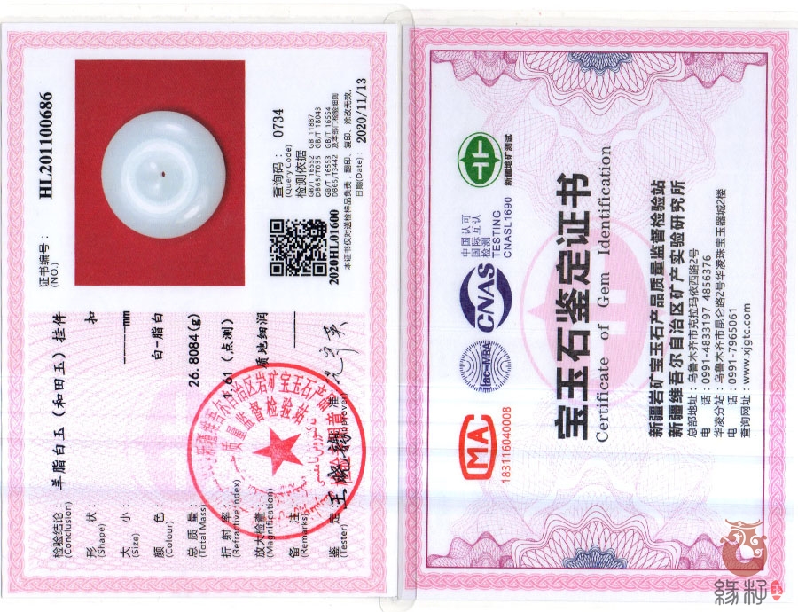 (附:新疆岩矿宝玉石产品质量监督检验站国家和田玉产品质量监督检验中心样例)