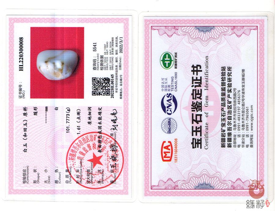 (附:新疆岩矿宝玉石产品质量监督检验站国家和田玉产品质量监督检验中心样例)
