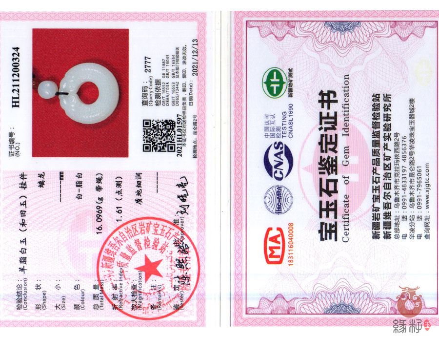 (附:新疆岩矿宝玉石产品质量监督检验站国家和田玉产品质量监督检验中心样例)