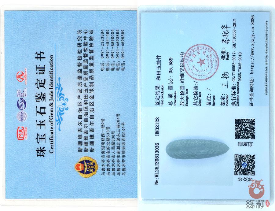 (附:新疆岩矿宝玉石产品质量监督检验站国家和田玉产品质量监督检验中心样例)