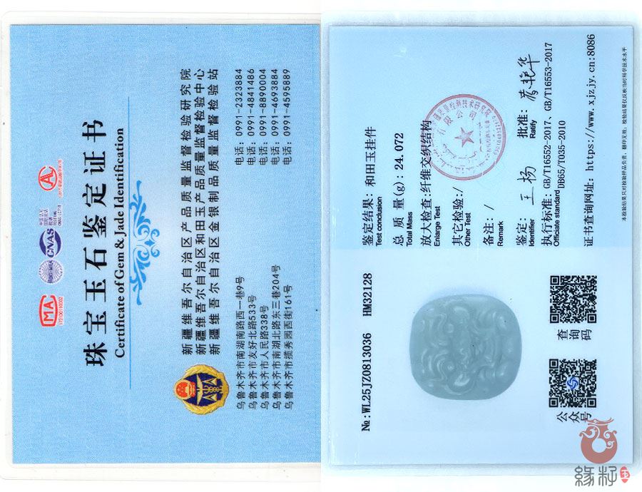 (附:新疆岩矿宝玉石产品质量监督检验站国家和田玉产品质量监督检验中心样例)