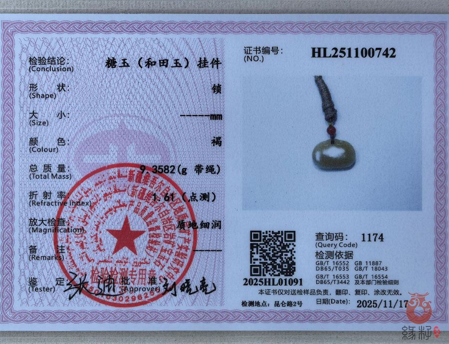 (附:新疆岩矿宝玉石产品质量监督检验站国家和田玉产品质量监督检验中心样例)