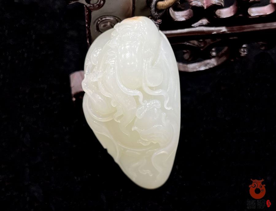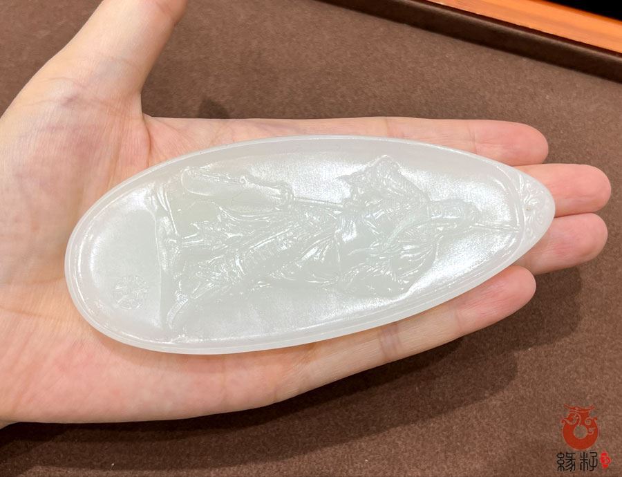 第五、羊脂白玉关公是最受推崇的,因为羊脂白玉质地油润细腻,洁白无瑕,最能体现关公的圣洁、正直与高贵气质,价值也最高。我们这件和田羊脂白玉籽料关公乘龙挂件目前排在第五位,关公立于龙背,表现其驾驭天地之力、巡守乾坤的神性。摆放于华凌玉器城缘籽臻品店中10柜,标价96000元,重:52.4569g,长62mm宽28mm厚18mm,采用和田玉独籽料雕刻,大满皮毛孔清晰自然,形态规整,圆润饱满,大小适中,天然黑油皮;玉质温润细腻,油润光泽,细糯老熟,质感浑厚,肉眼无结构且均匀致密洁净,是稀有高端籽料羊脂玉收藏级臻品;又是知名玉雕师传统经典设计雕刻,神态亲善祥和,动静神似,专业柔光技工精心细致多遍打磨,柔光层次分明,油糯,高贵典雅,意,形,材,工集作品于一体。