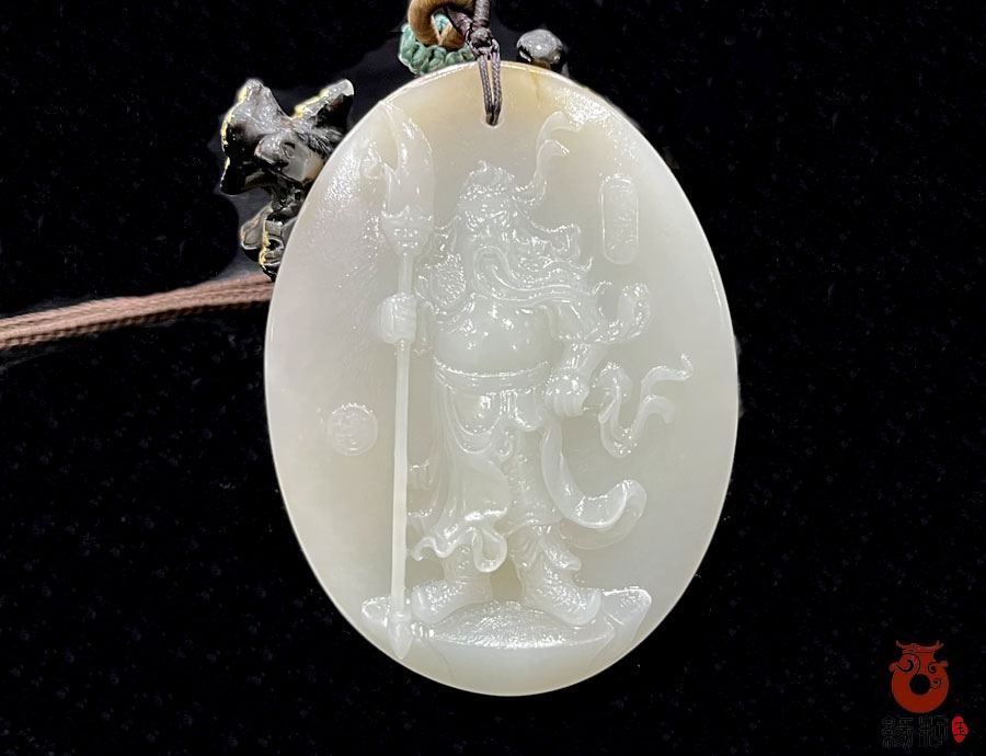 第三、关公手持青龙偃月刀,形象威武,具有强大的正气和煞气,能够驱邪避凶、辟邪护身、镇守家宅保平安、保佑佩戴的人们平安顺遂远离邪祟。这件和田玉羊脂白玉光白籽料关公挂件是目前我们店排列第三的一件宝贝,摆放在华凌玉器城缘籽臻品店中2柜,标价63万。重80.907g,长70mm宽35mm厚25mm,采用的是和田玉独籽光白籽雕刻,背面精巧留有白皮子,头顶处留有天然黄色皮。精巧留皮,毛孔清晰自然,造型圆润规整,大小适中;玉质温润细腻,油润光泽,细糯老熟,质感浑厚,肉眼直观无结构且均匀致密洁净,是稀有高端光白籽料羊脂玉收藏级臻品,雕工精细,惟妙惟肖,是一件难得的干净、油润、无瑕臻品。