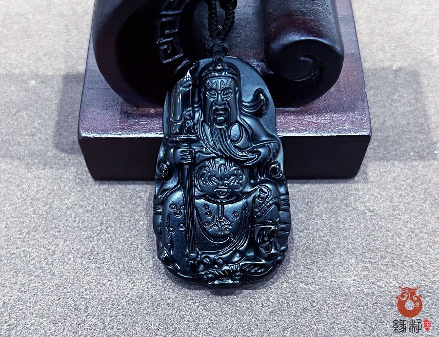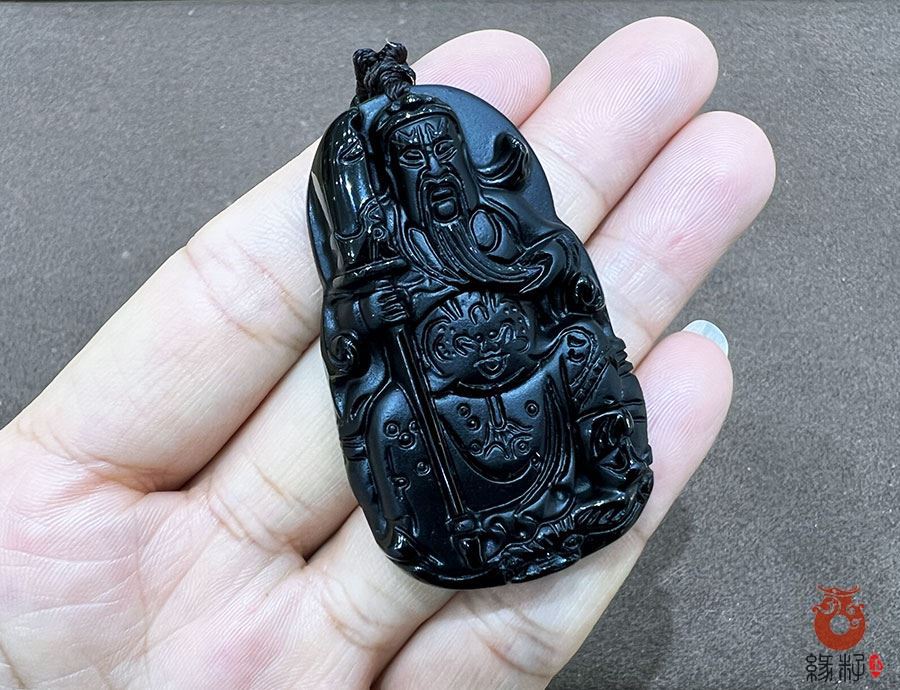 第十、黑曜石在传统文化中被视为"阿帕契之泪",具有极强的吸收负能量,化解煞气的功效,常用于制作关公牌,帮助佩戴者阻挡邪祟,消除厄运。这件黑曜石关公挂件排在最末一位,标价1600元。摆放于盈科广场缘籽玉器总店高5柜下柜。重24.42g高52.2mm宽32.2mm厚10.4mm。黑曜石对应人体海底轮,有助于稳定情绪,清除杂念,增强佩戴者的定力与决断力,与关公的"果敢刚毅"精神相呼应。青龙偃月刀(关刀)是关公的兵器,象征斩断困境,开拓前路。寓意在事业或生活中克服障碍,勇往直前,尤其受创业者,竞技者青睐。
